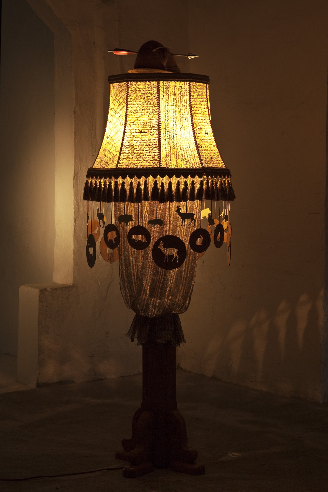 Pro und Contra zum Thema "Jagd", eine kritische Auseinandersetzung: von Lust bis Frust, von Zeter und Mordio, von Kultur versus Natur. Der Schirm ist außen und innen reich bebildert und beschriftet, und zwar so, dass in ausgeschaltetem Zustand die Freude am Jagen sichtbar wird, eingeschaltet jedoch die bittere Schattenseite des Contra von innen durch das Pro hindurchleuchtet. Diese ehrwürdige Leuchte hat etwas Unwirkliches an sich: Unter den dicken pompösen Troddeln schweben karussellgleich die Geister der getöteten Tiere samt ihren Zielscheiben.